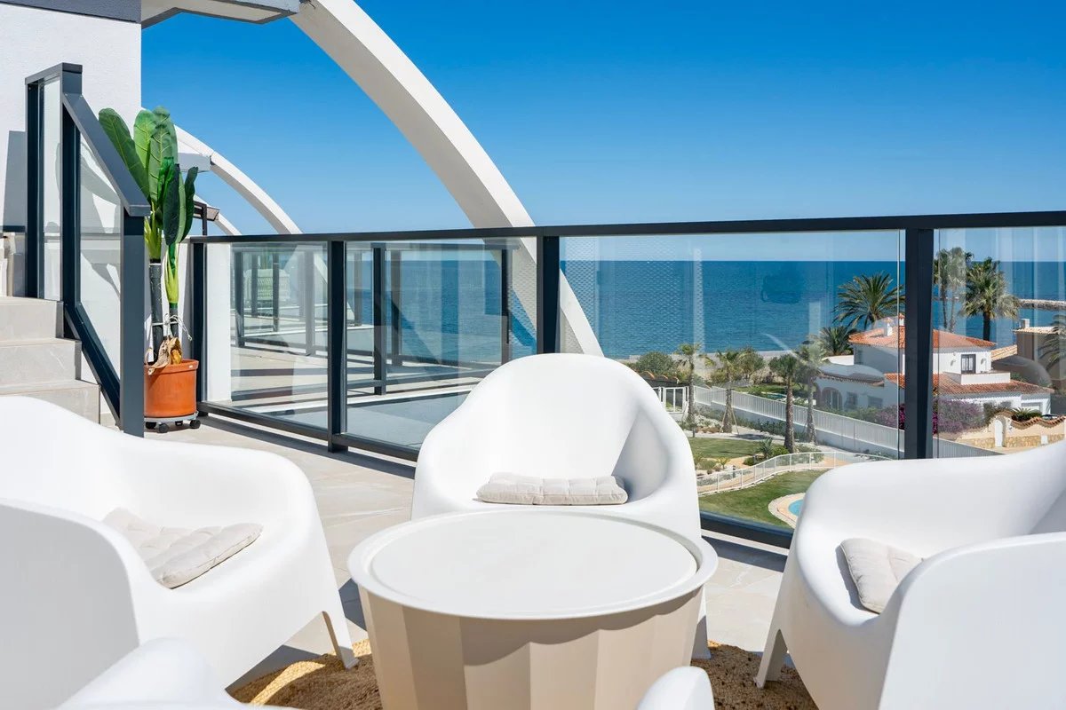 Fantastic luxury penthouse with panoramic sea views, located on the sandy beach of Playa de la Almadraba, in the modern Taylor Wimpey Bella Beach complex. This exclusive penthouse has stunning sea views from all rooms and also features a rooftop terrace of no less than 94.85 m2 where you can enjoy spectacular 360° views. To the east, the coastline stretches to Gandía, to the west the towers of the Montgó mountain, to the north you can see the sea directly, and to the south it overlooks the impressive Sierra de Segaria.
