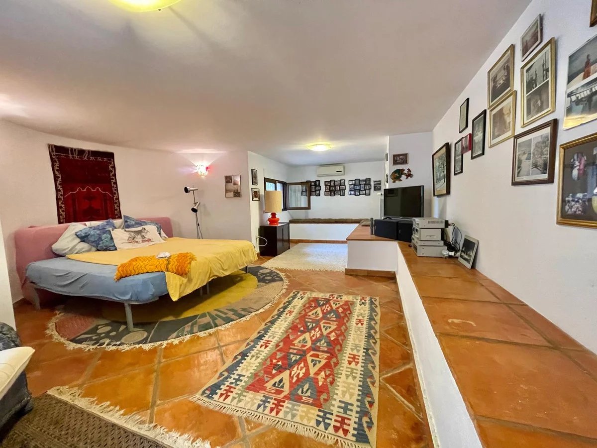 Main Floor: A spacious, light-filled living-dining area with high ceilings and split-level design adds a unique character. The fully equipped kitchen opens to a patio with a barbecue area and summer kitchen, perfect for entertaining. This level also includes the primary bedroom with a fitted wardrobe and en-suite bathroom, along with a guest toilet. The highlight of this floor is a spacious glass-enclosed naya that opens to the garden and offers unbeatable views of the pool, sea, and mountains.
