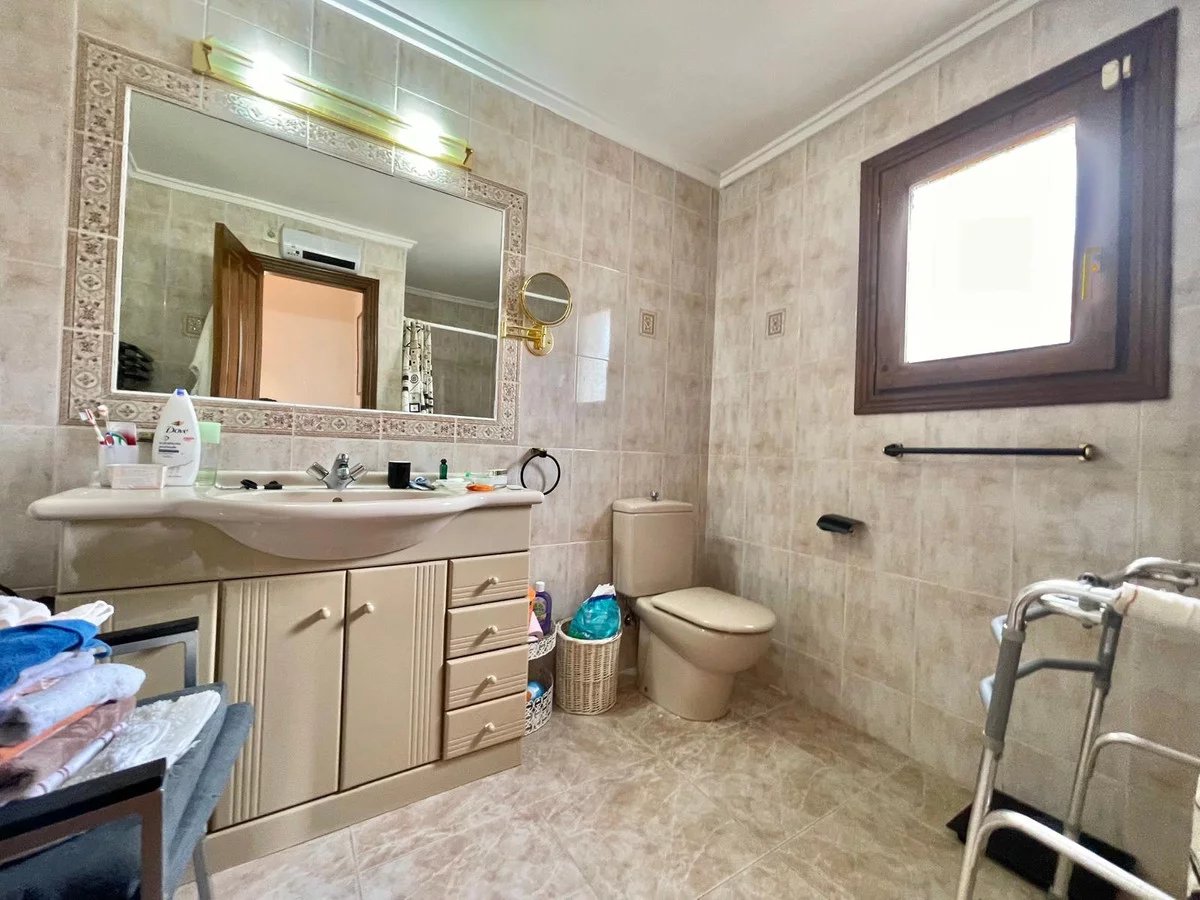 Upper Floor: Two large bedrooms, each with en-suite bathrooms and fitted wardrobes, are located on this floor. A cozy sitting area with television leads to a private terrace, ideal for relaxing and taking in the sea views. Currently, one of these bedrooms is used as a home office.