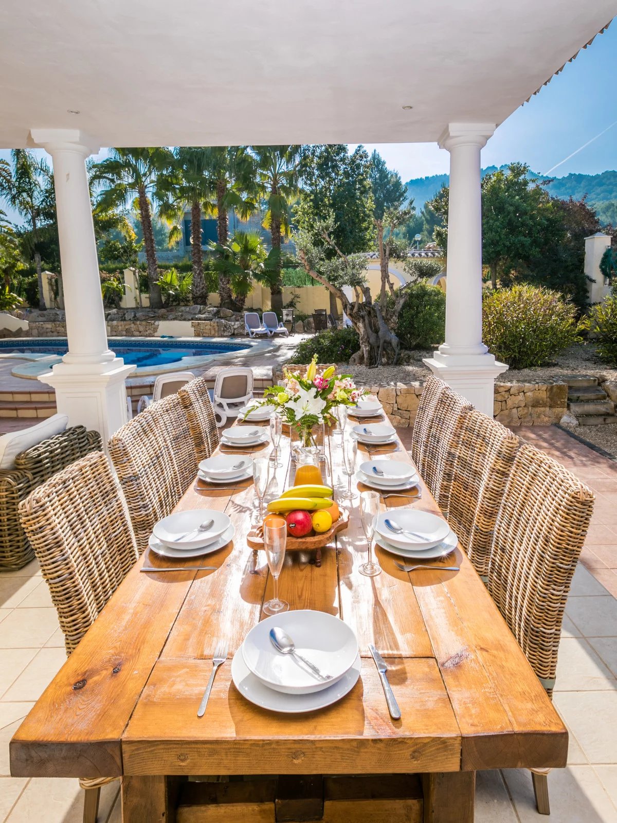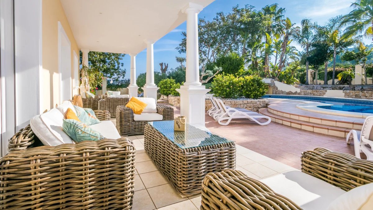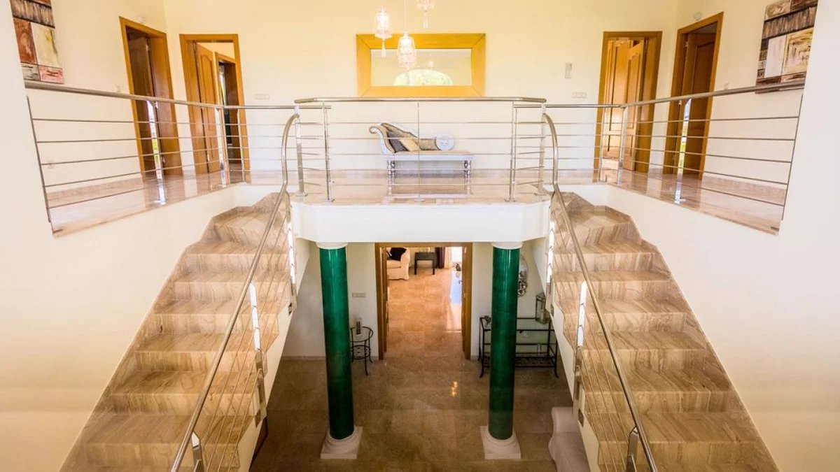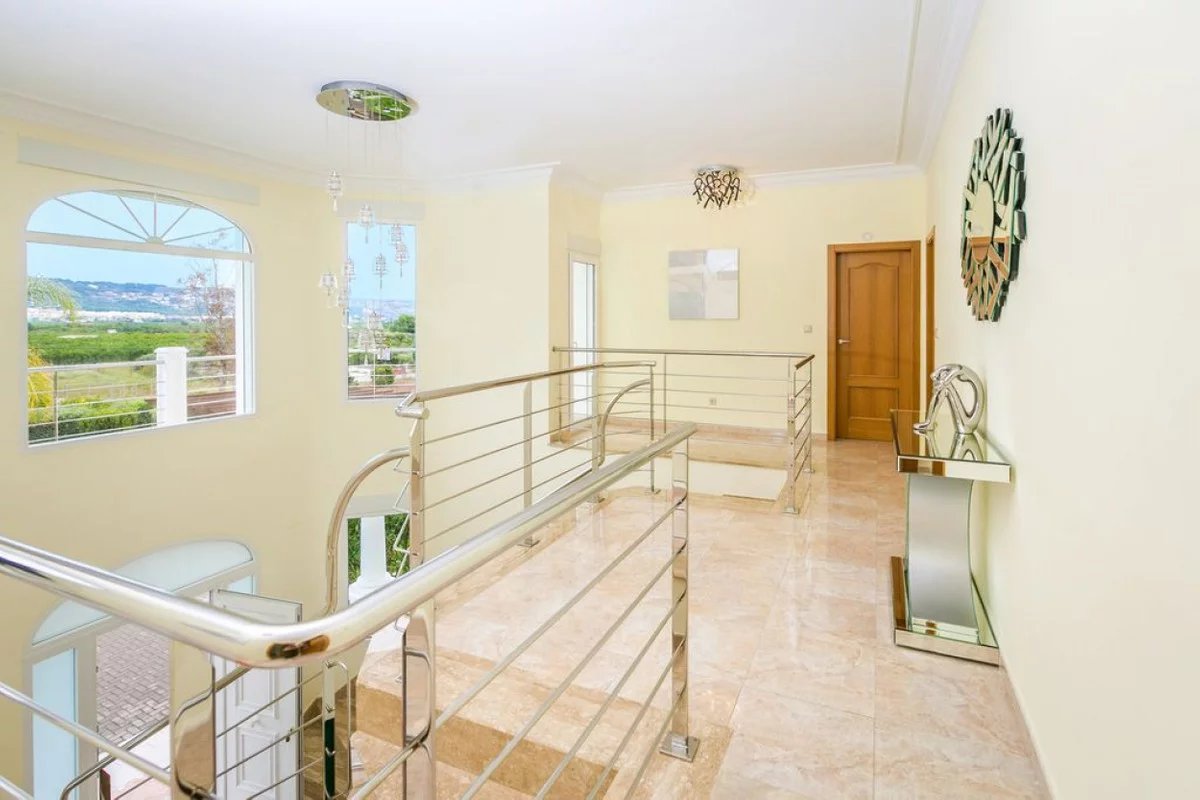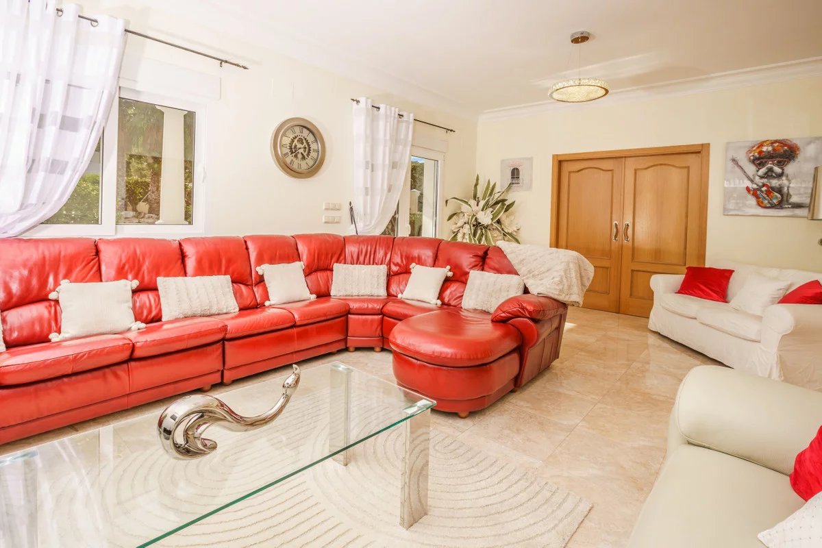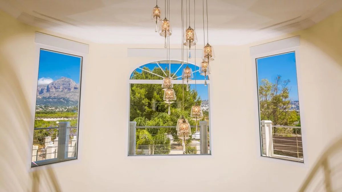 Luxury villa for sale in Javea. This exceptional 6-bedroom, 5-bathroom villa is set within beautifully landscaped gardens offering complete privacy, this stunning property blends traditional meditteranean design with high-end modern comforts.The villa welcomes you with an impressive hallway, featuring high ceilings and a grand double stair case made from marble and stainless steel. Open-plan living spaces are filled with natural light. On the ground floor we find a fully fitted modern kitchen with all appliances, a large open plan living room / dining area, with both the living room and dining area having patio doors leading straight out to the covered terrace. Also on this floor we have a good sized double room and a single room which could be used for an office space or kept as a bedroom, these bedrooms share a bathroom with shower.Upstairs there is an impressive landing with picturesque views towards the montgo mountain. We have four bedrooms on this level, all with ensuite bathrooms and the master bedroom having an en-suite with bath. There is also a large balcony that faces towards the back of the property overlooking the garden and pool, this can be accessed via the master bedroom and the adjacent double bedroom.The south facing 1800m2 plot is perfectly landscaped for easy maintanence, the large heated swimming pool can be enjoyed all year round and boasts a feature waterfall. The sun soaked terrace has plenty of room with seating and sunbeds along with an equipped covered BBQ area. To the front of the property there is an impressive driveway with parking for several cars, acessed via an electric gate.Additional features include underfloor heating, hot and cold air conditioning, security system and electric persianas on all windows. Located just minutes from Jávea's award-winning beaches, fine dining, international schools, and golf courses, this villa offers an unparalleled lifestyle in one of the Costa Blanca's most prestigious enclaves.
