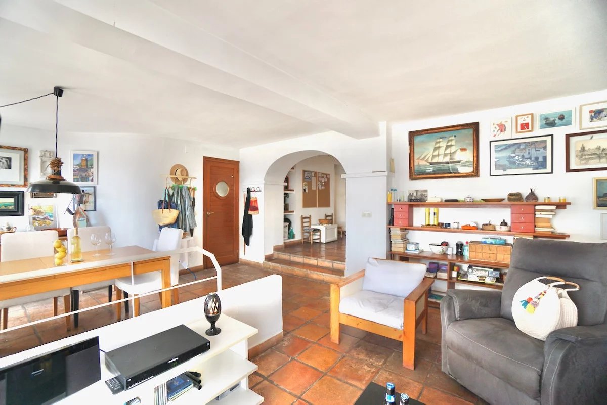 Heb je altijd gedroomd van een appartement met een ruim terras en panoramisch uitzicht op de zee en de Peñon de Ifach, dan is dit je kans! Het appartement bestaat uit twee verdiepingen die met elkaar verbonden zijn via een binnentrap, die je kunt betreden vanaf straatniveau of direct via de hoofdverdieping. De gemeenschappelijke buitentrap leidt naar de voordeur om het ruime privéterras te betreden en je wordt meteen overweldigd door het turquoise water van de Middellandse Zee en het indrukwekkende uitzicht recht voor je! Hier kun je de hele dag van de zon en de voorbij varende boten genieten. Grote ramen openen naar de lichtrijke woon-eetkamer in traditionele Ibiza-stijl met terracotta vloeren. Verder op dezelfde verdieping vindt je een eerste kleinere kamer of kantoor, de aparte keuken, een badkamer met bad en een tweepersoonsslaapkamer met een ingebouwde kledingkast.Op de onderste verdieping vind je nog twee slaapkamers en toegang tot een patio met veel potentieel. Hier kun je je eigen privé-oase creëren met planten etc. of het ombouwen tot een parkeerplaats. Tot slot is er ook nog een apart toilet, een buitendouche en een wasruimte met boiler. Het is ook mogelijk om het benedengedeelte te gebruiken voor commerciële doeleinden.Dit appartement ligt op een unieke locatie en je zou er na een verbouwing een juweeltje van kunnen maken.